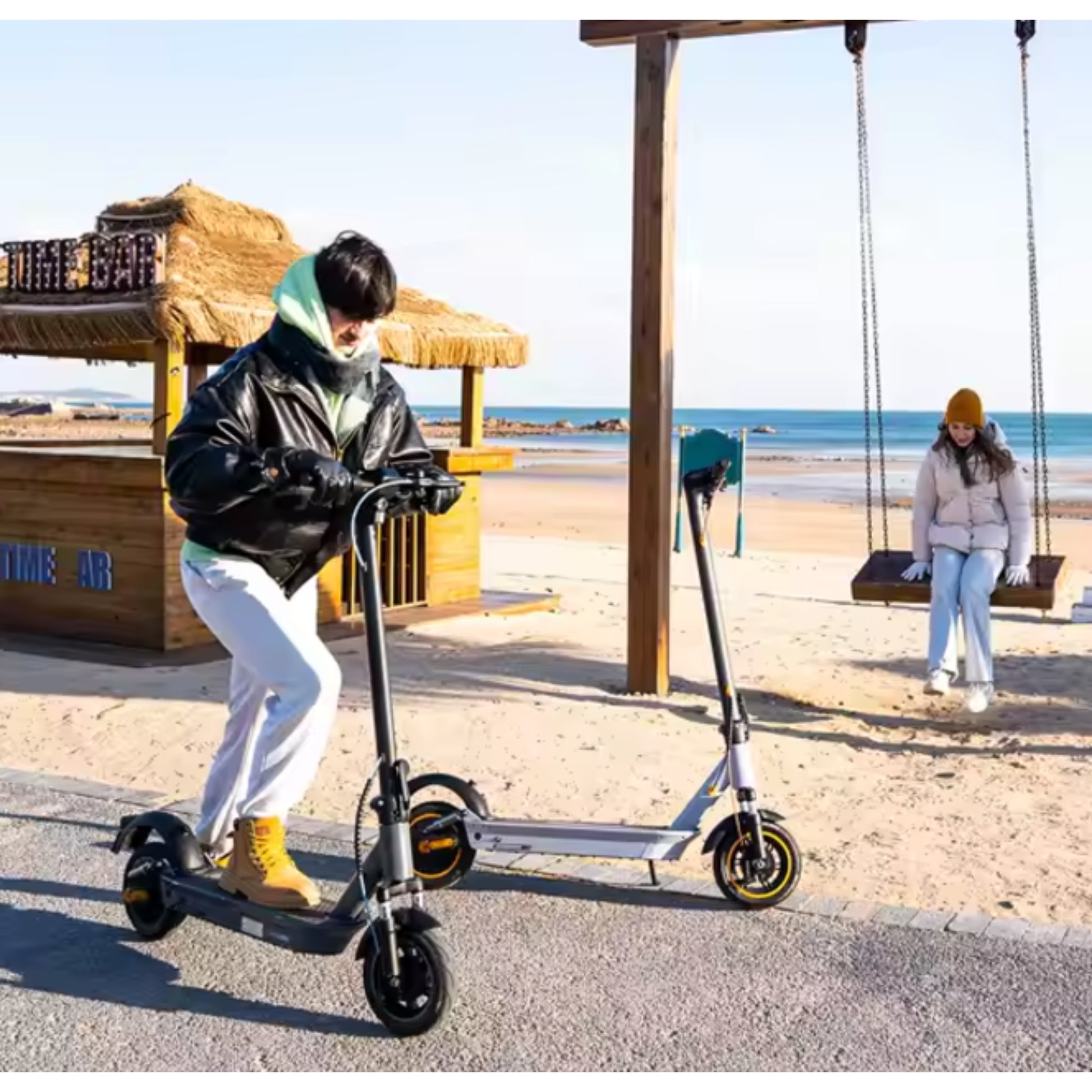 The SwiftRide AeroX Urban Electric Scooter is designed for those who demand the best in sleek, efficient city travel. This high-end scooter features a lightweight aluminum frame, front suspension, and a powerful rear motor for smooth acceleration. With a built-in brake light, textured deck for grip, and stylish orange accents, the AeroX delivers both performance and personality for modern commuters.